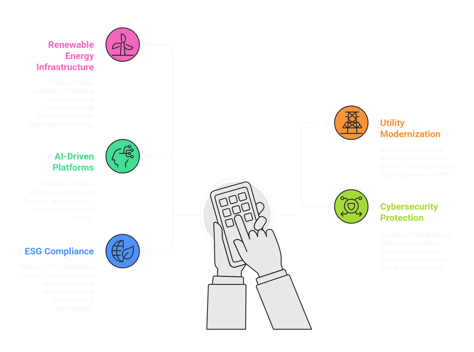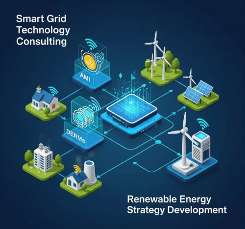 - Smart grid technology consulting, including IoT integrations, AI analytics, and grid automation solutions.