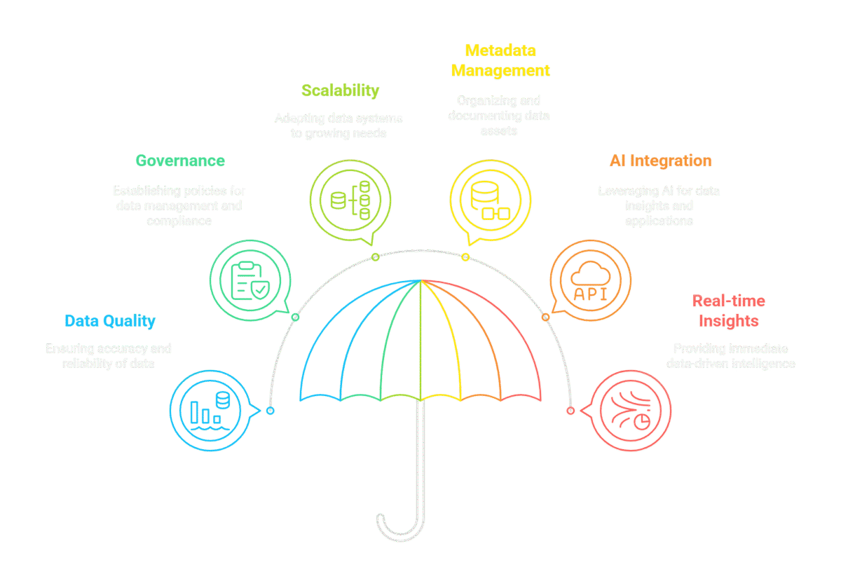 - Data mesh and domain-driven ownership models improve scalability and accountability.