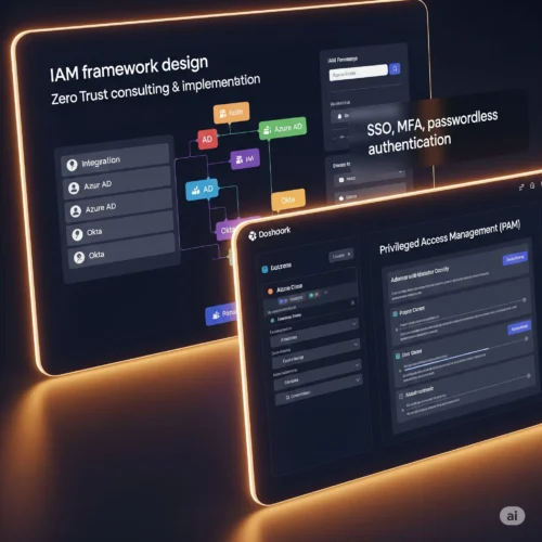 - SSO, MFA, and adaptive authentication deployment for users, devices, and services.