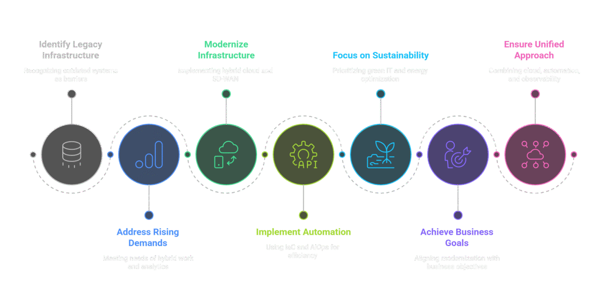 Green IT and energy optimization are becoming priorities due to ESG mandates. Automation is key—enabling zero-touch provisioning, proactive monitoring, and rapid fault recovery. However, many organizations lack the tools, talent, or governance to modernize effectively. Infrastructure modernization must align with business continuity, cloud adoption, and digital experience goals. A unified approach combining cloud infrastructure, automation tooling, and observability is essential for high-performing, future-ready operations.