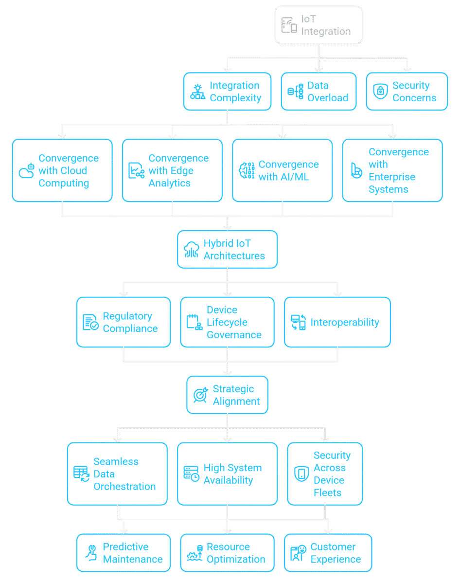 Hybrid IoT architectures combining edge and cloud models will dominate in 2025+, allowing faster processing and cost-effective scalability. Regulatory compliance, device lifecycle governance, and interoperability are additional challenges. Success hinges on aligning IoT use cases with strategic objectives, ensuring seamless data orchestration, and maintaining high system availability and security across device fleets.