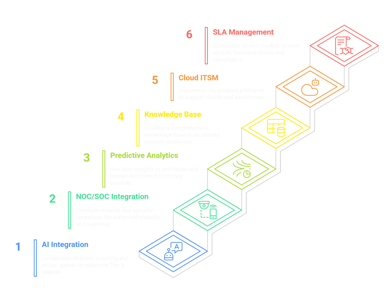 Increasing complexity and remote workforces require omnichannel support, 24/7 availability, and rapid escalation paths. AI-driven chatbots and self-service portals reduce workload and improve satisfaction. Effective ITSM integration with monitoring and analytics tools improves root cause analysis and SLA adherence. The challenge lies in balancing automation with human empathy and continuously evolving service models to meet business needs.