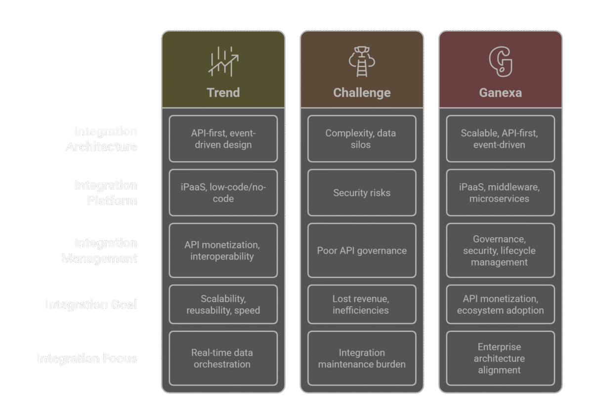 Real-time connectivity is expected—not optional—and poor integration translates into lost revenue, fragmented insights, and operational inefficiencies. API monetization, platform interoperability, and governance have become priorities as organizations build digital ecosystems. In 2025+, successful integration strategies must support scalability, reusability, and speed, all while embedding robust governance and security.